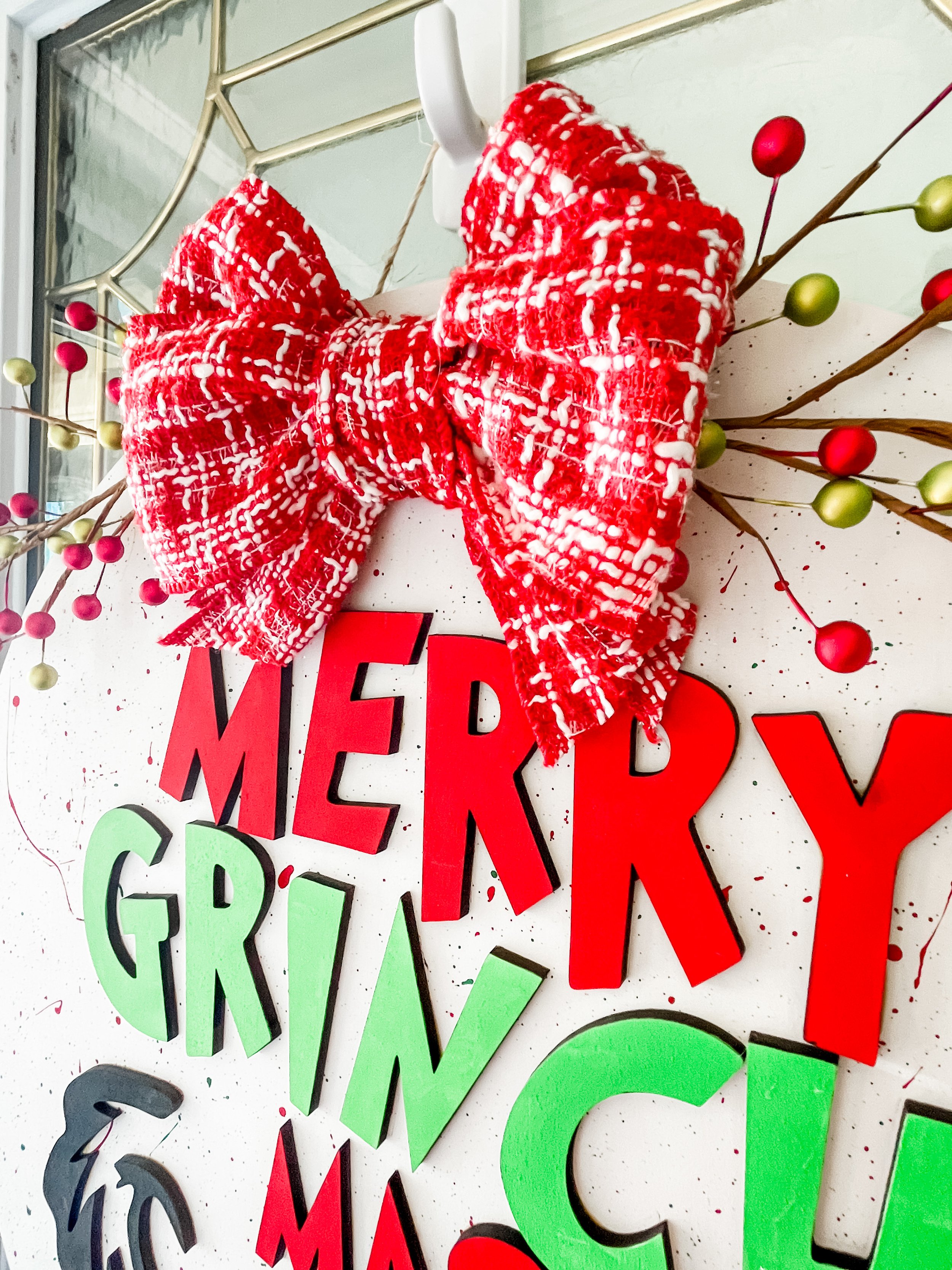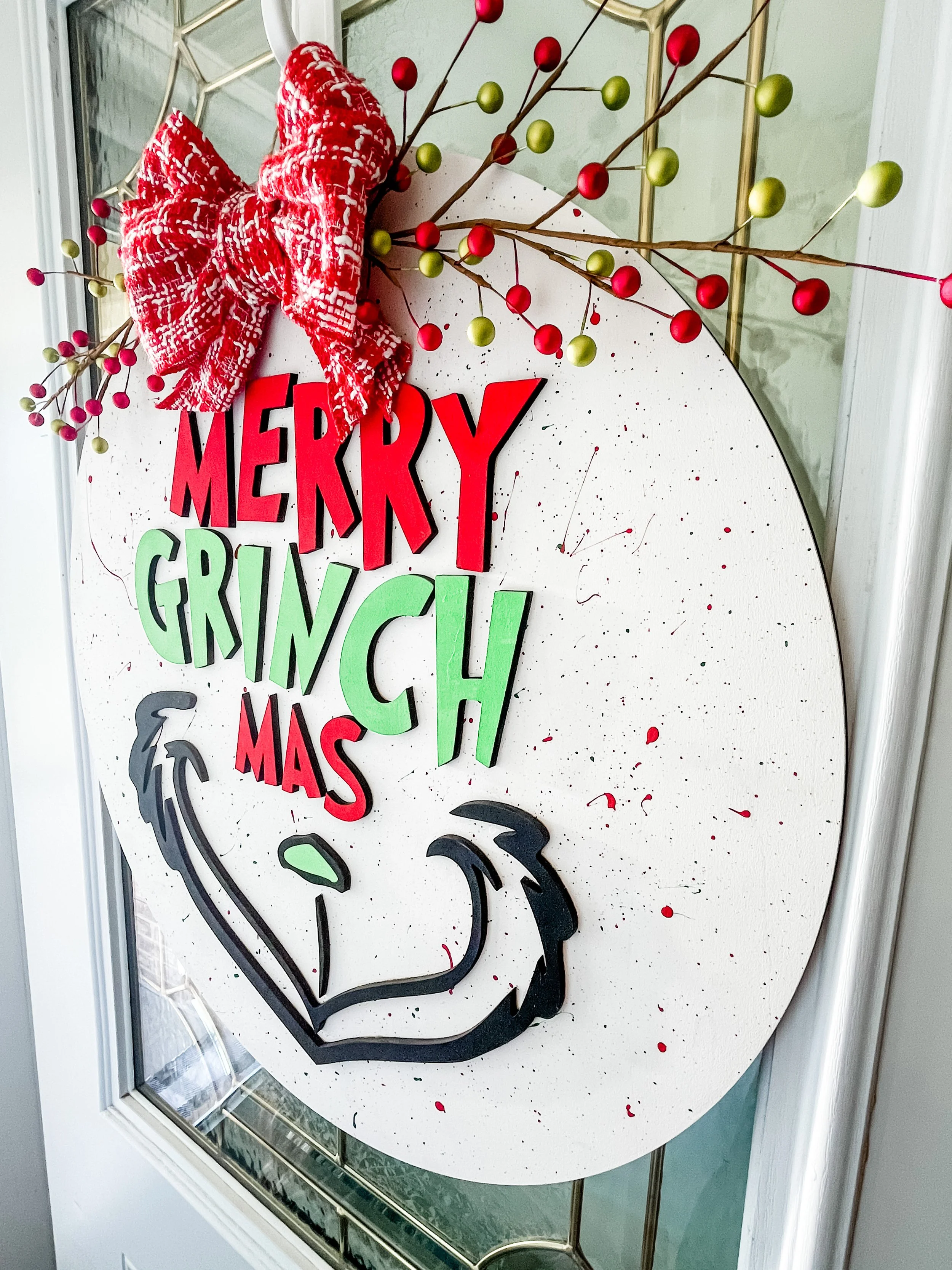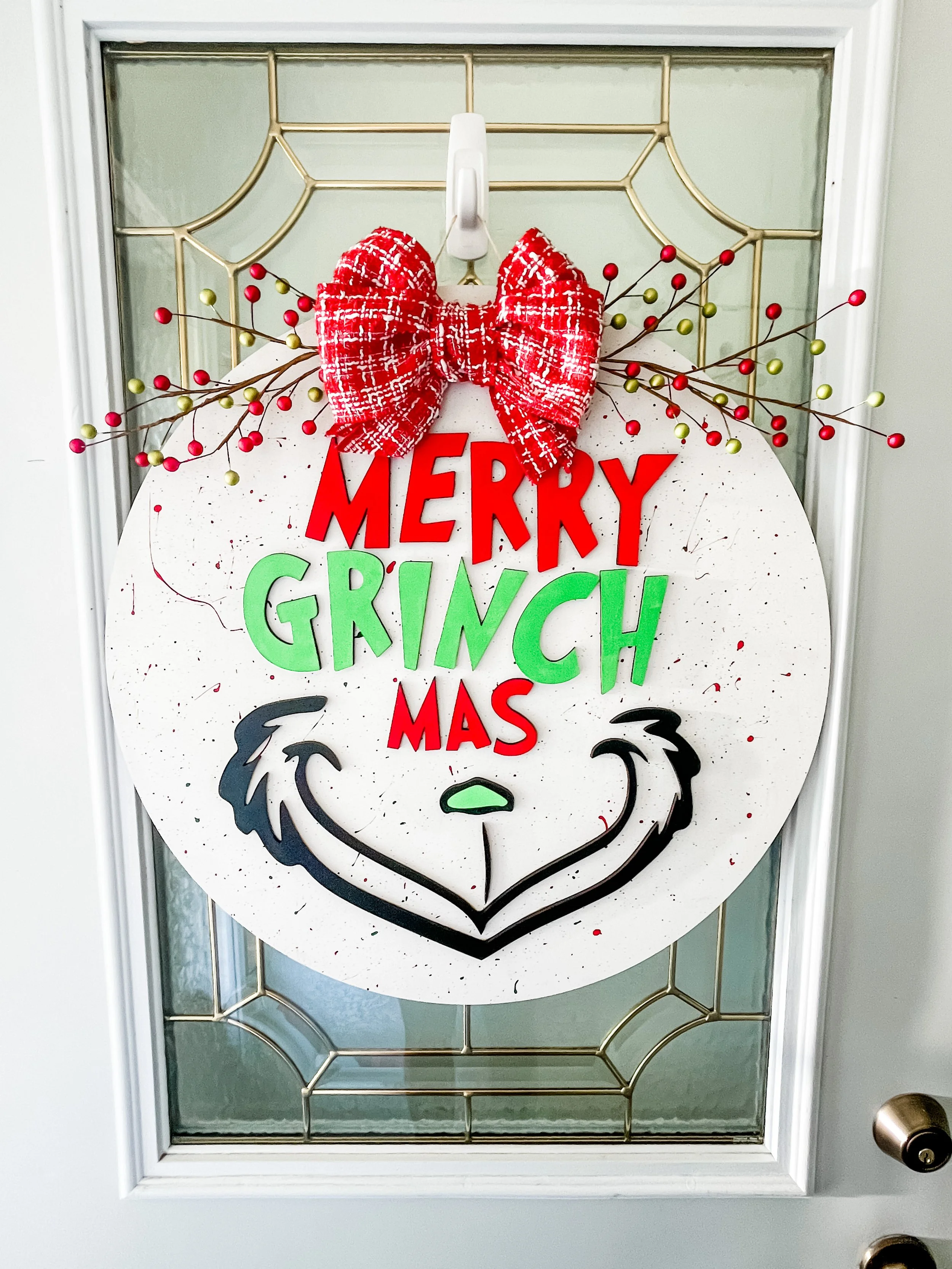 Bring a little mischief and holiday cheer to your front door with our "Merry Grinchmas" door hanger!